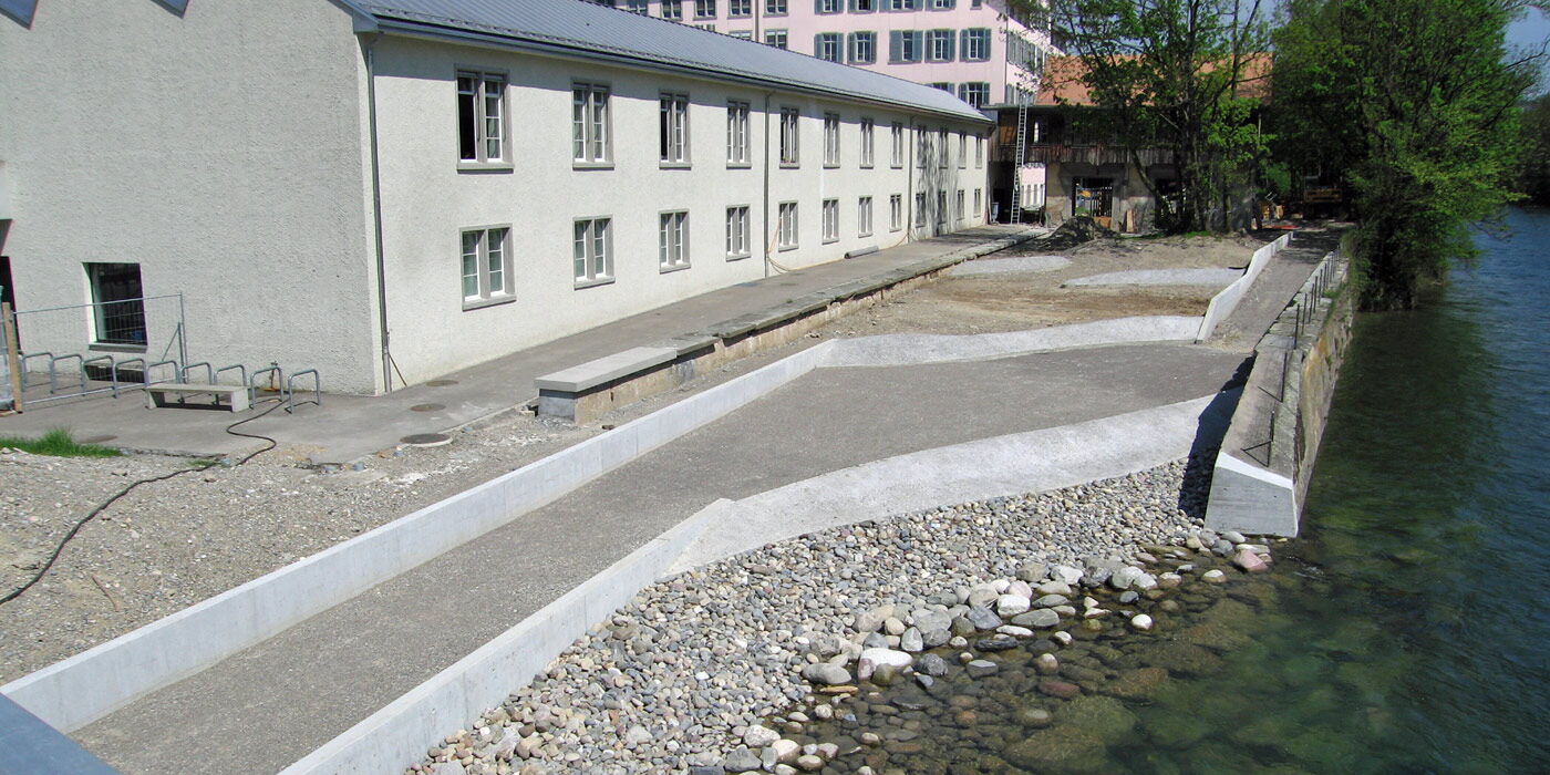 Neugestaltung des Industrieareals der ehemaligen Seidenstoffwebereit mit frei zugängligchen Erholungsflächen und neuen Uferbauten |