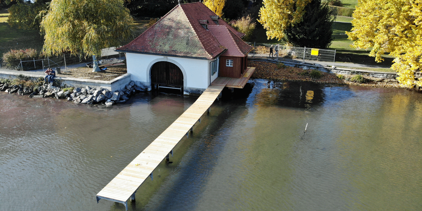 | Projektbeschrieb: | Instandsetzung des Bootshauses mit Badehausanbau, der umliegenden Steganlage und der angrenzenden Ufermauer in Zusammenarbeit mit der Denkmalpflege und dem Hochbauamt des Kantons Zürich |
