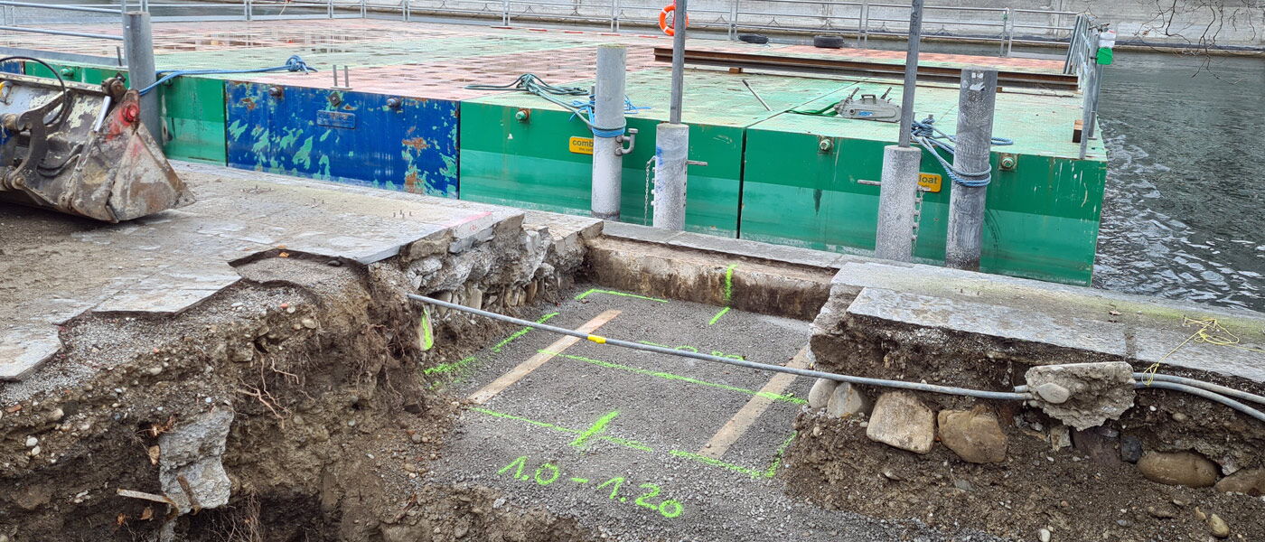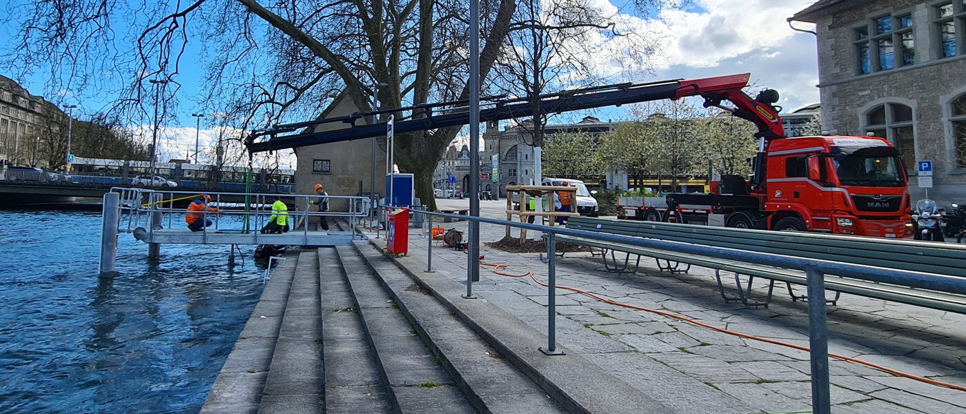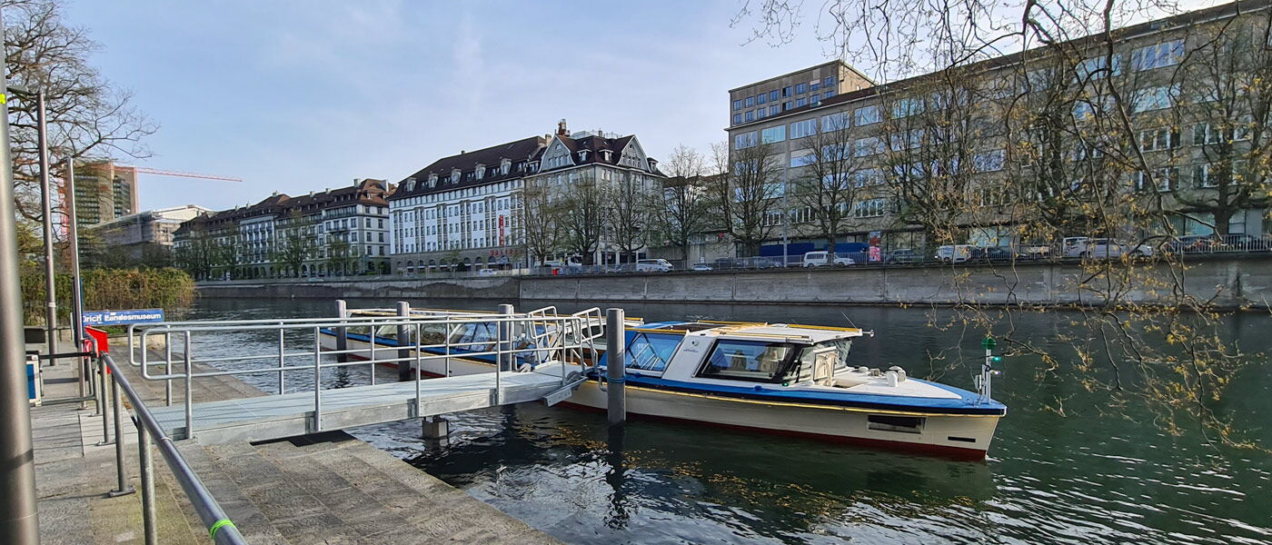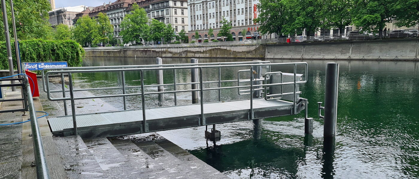 Die Haltestelle Landesmuseum wurde im Jahr 1975 erbaut. Der Steg wird von der Zürichsee Schifffahrtsgesellschaft (ZSG) betrieben und von den Gästen zum Zustieg zu den Limmatbooten bzw. zum Ausstieg von den Booten genutzt. Durch den knapp 50-jährigen Steg war die hindernisfreie Begehung der Boote nach den heute geltenden Gesetzen und Richtlinien nicht mehr gewährleistet. Der alte Steg und die Prellanlage wurden zurückgebaut. Der neue, höhenverstellbare Steg ermöglicht den Fahrgästen nun unabhängig vom Wasserstand, sicher und hindernisfrei vom Land auf die neuen, rollstuhlgängigen Limmatboote bzw. von den Booten an Land zu gelangen. Der Landungssteg ist mit einer neuen, unabhängigen Prellvorrichtung geschützt. |