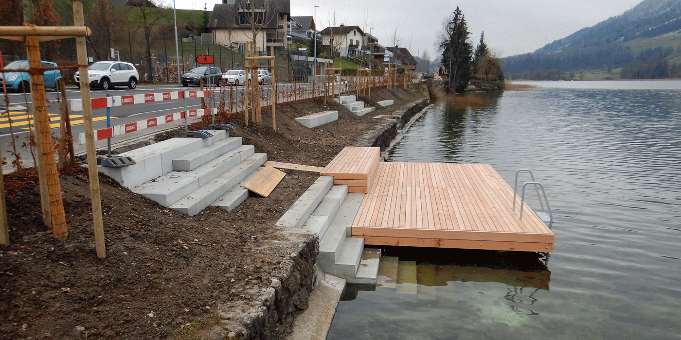 Neuer Seezugang beim Schulhaus Morgarten am Ägerisee, Erstellung einer Badeplattform, Planung und Umsetzung, sichere und attraktive Badezone, direkte Seezugang |