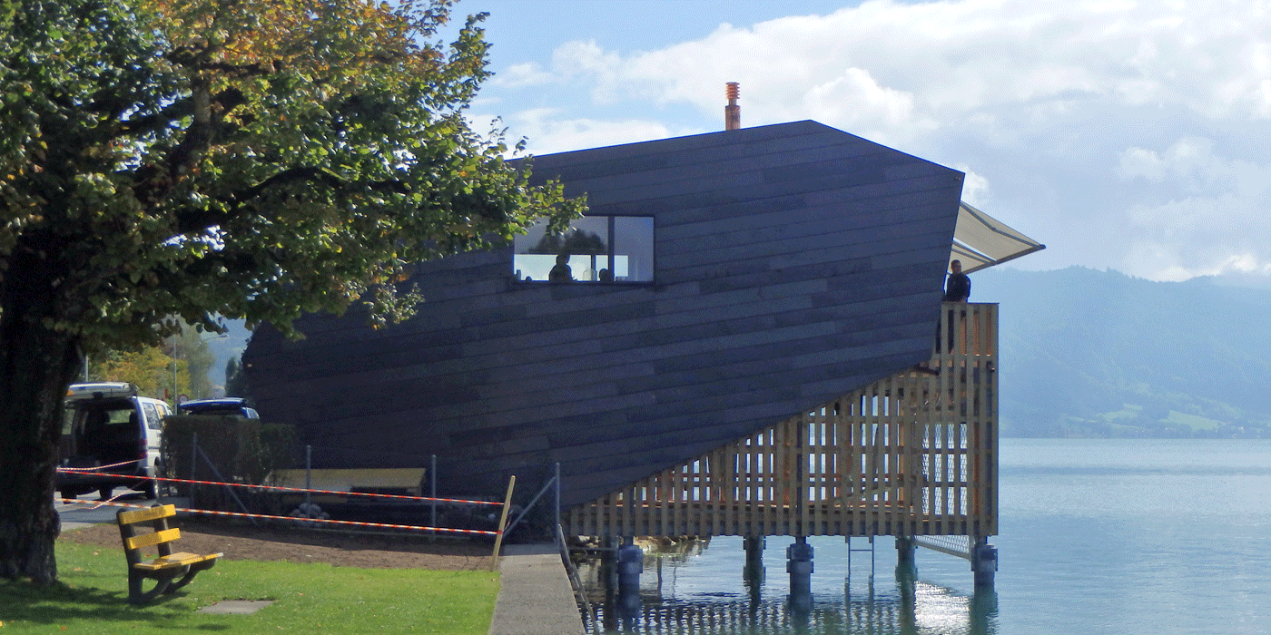 | Projektbeschrieb: | Vollständiger Abbruch des bestehenden Bootshauses. Neues Bootshaus in Stahl-Holz-Konstruktion auf Stahlpfählen im See und auf einer gepfählten Betonbodenplatte an Land |
