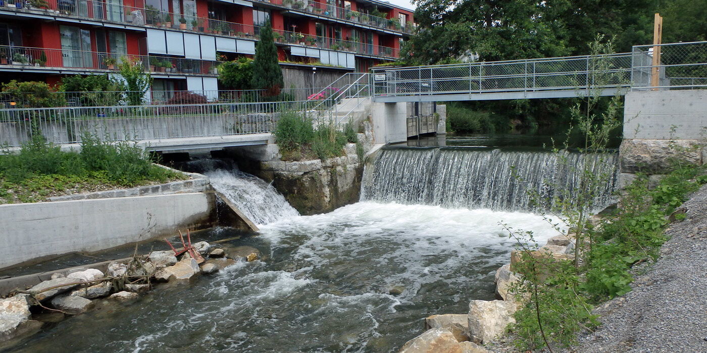 | Projektbeschrieb: | Wehrumbau mit Absenkung der Bachsohle, Ersatz der Wehrklappe mit hydraulischem Antrieb und Anpassung der Umgebung |