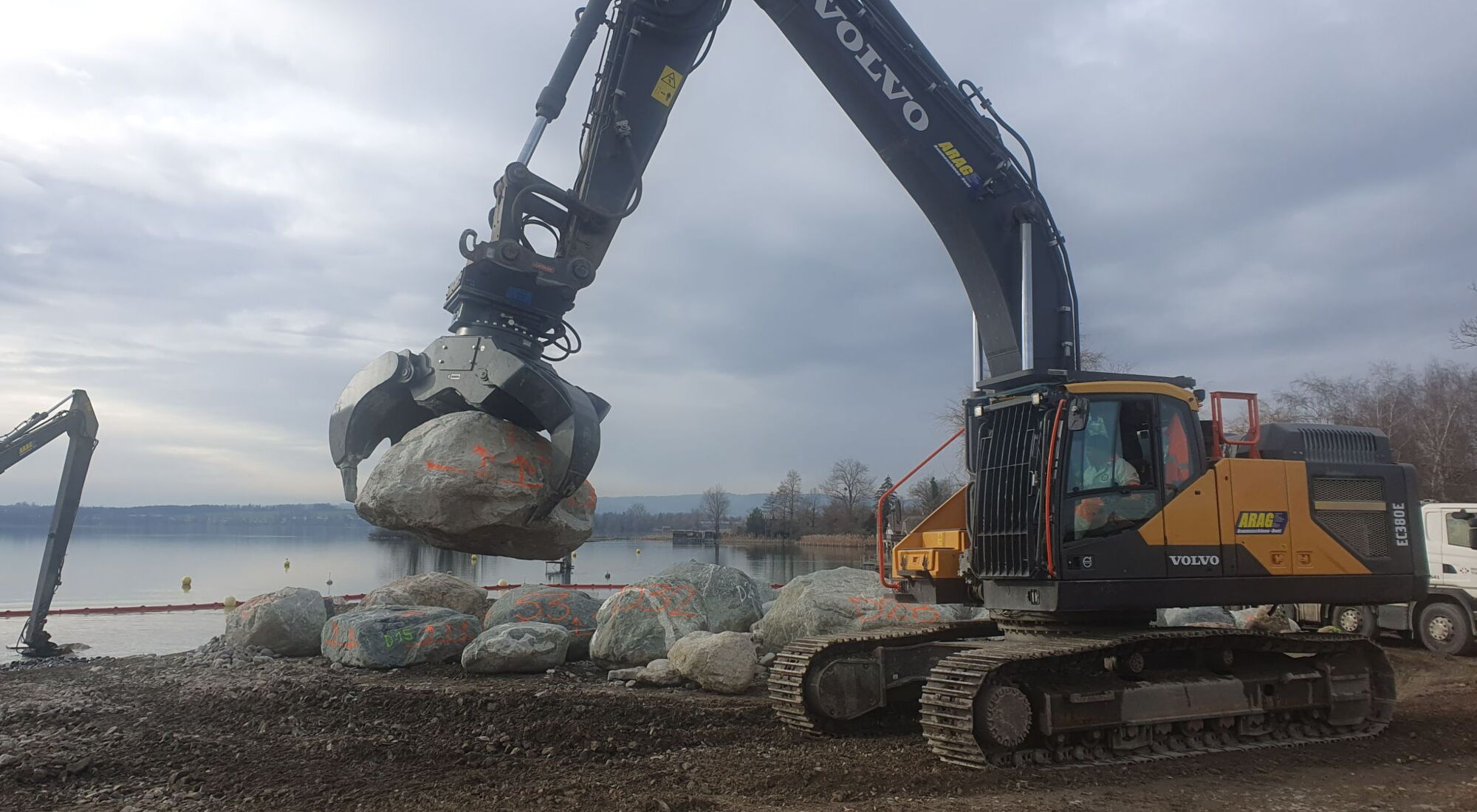 Der neue Strand und Flachwasserbereich wird künftig mit zwei Buhnen gesichert. Die Buhnen bestehen aus Kies und bis zu 20 Tonnen schweren Findlingen. Diese Findlinge werden im Seegrund eingebunden und bilden später das Fundament für einen Badesteg.