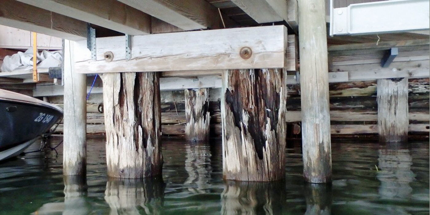 Die Holzpfählungen von Stegen und Bootshäusern sind dauerhaft Wasser, Feuchtigkeit und biologischen Einflüssen wie Pilzbefall und Fäulnis ausgesetzt. Dadurch können im Laufe der Zeit verdeckte Schäden und Schwächungen im Material entstehen. Solche faulen oder beschädigten Holzbereiche mindern die Tragfähigkeit der Konstruktion erheblich und stellen ein erhebliches Sicherheitsrisiko für Nutzerinnen und Nutzer dar. |